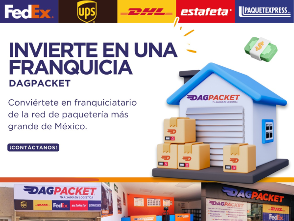 ¿Deseas generar un INGRESO EXTRA? En la franquicia Dagpacket te ofrecemos la oportunidad de tener una franquicia de mensajería y paquetería local, nacional e Internacional, además de la venta de empaques para envíos.